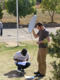 Sarah Buchner was on hand to meet the students when they arrived, and started the practical the next day. The first experiment was to use a hand-held satellite dish to detect the Sun, and make an estimate of its brightness temperature.
