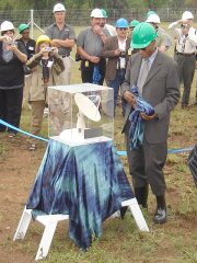 2006 11 02 XDM ground-breaking at the Hartebeesthoek Radio Astronomy Observatory by the Minister of Science and Technology, Mosibudi Mangena, shown here with a model of the telescope.